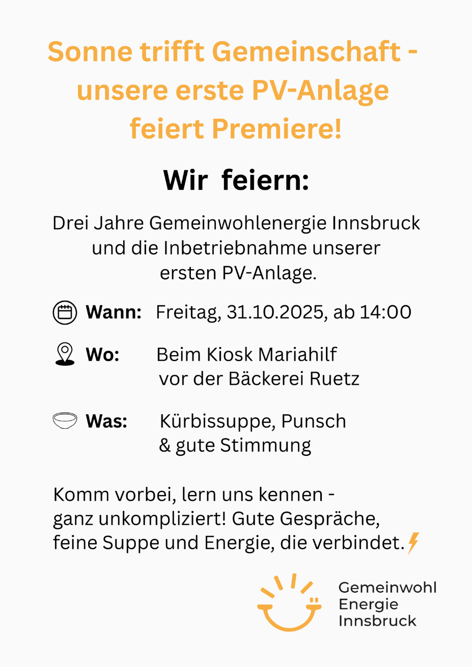 Wir von der Gemeinwohlenergie Innsbruck (GEI) haben uns zum Ziel gesetzt, Tirol und Österreich mit 100% erneuerbarer Energie in und aus Bürger:innenhand zu versorgen. Unser Verein wurde von Menschen gegründet, die die lokale Energiewende voranbringen und sinnvolle Maßnahmen gegen die Klimakrise setzen wollen.